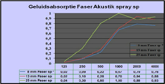 Faser Akustik Spray sp is een geluid absorberende pleister, aangebracht in verschillende lagen geeft het de navolgende geluid absorptie waarden.