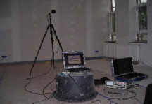 Foto links: Eigen testopstelling voor het meten van de nagalm tijd / geluid absorptie in de nieuwbouw.